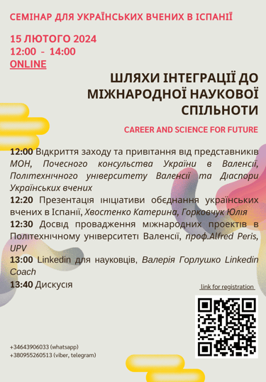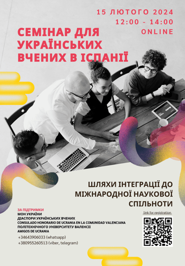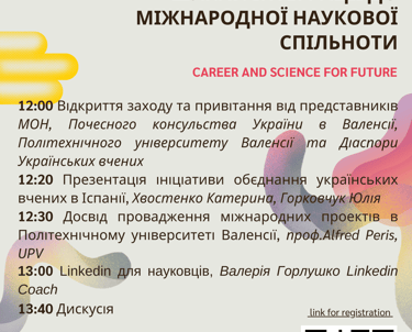 On February 15, 2024, the first meeting of Ukrainian scientists in Spain "Ways to integrate Ukrainian scientists into the international scientific community" was held. The meeting was organized by Ukrainian scientists at the Polytechnic University of Valencia - Julia Horkovchuk and Kateryna Khvostenko.