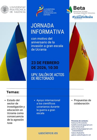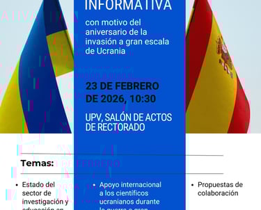 Special thanks for their participation and support to the Honorary Ambassador of Ukraine in Valencia, Mr. Pablo Gil, Vice-Rector for Arts, Sciences and Technology of the Polytechnic University of Valencia, Ms. María Salomé Cuesta Valera, and co-founder of the strategic initiative "Ukrainian Science Diaspora", Ms. Yevhenia Polishchuk